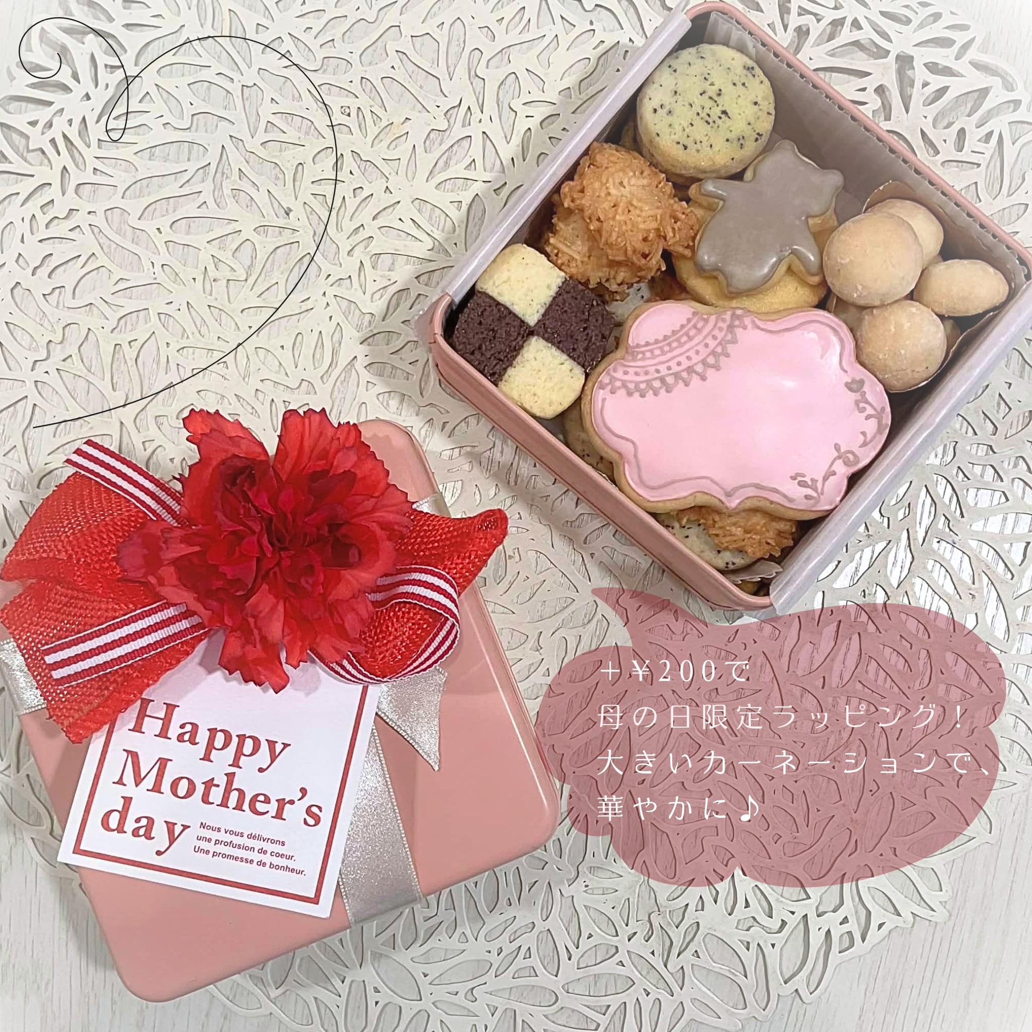 +200円で、母の日限定で華やかなリボンラッピングに変更可能です!